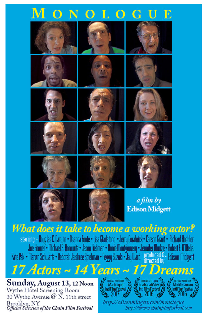 I just finished my first feature film, MONOLOGUE, a documentary that takes place over 14 years examining the lives of 17 New York City actors. See the website here.